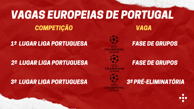 Bom, como toda federação, distribui conforme cada competição. Vamos começar falando do Campeonato Português: o campeão e o vice ganham acesso direto a fase de grupos da Liga dos Campeões. Vale destacar também que o campeão recupera o posto de cabeça de chave nos sorteios, o que, na prática, implica teoricamente em adversários mais acessíveis. Já o terceiro colocado, vai para a 3ª pré-eliminatória. Ou seja, precisa passar por duas eliminatórias antes de chegar aos grupos. Inclusive, foi nesse estágio da competição que o Benfica de Jorge Jesus foi eliminado na temporada 2020/21 para os gregos do PAOK de Abel Ferreira.