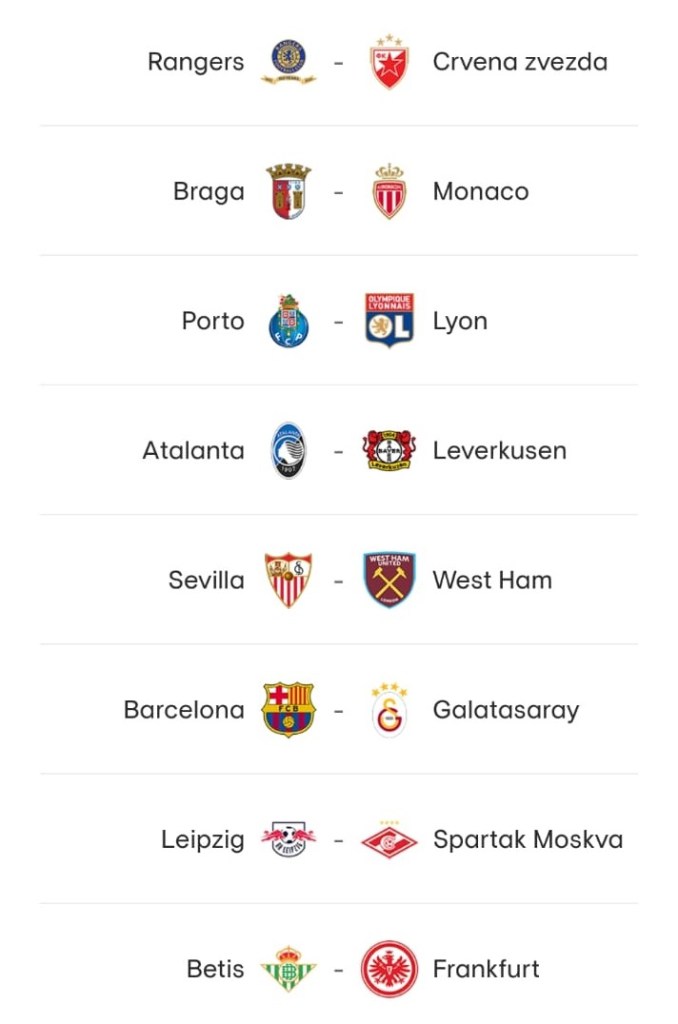 Lembrando que os times da direita fazem o segundo jogo em casa por terem sido os vencedores da fase de grupos da Liga Europa. Do outro lado, estão as equipes vencedoras do ‘play off‘ entre os que ficaram em 2° lugar na mesma fase de grupos (Rangers, Braga e Betis) e os 3° colocados da Liga dos Campeões (Porto, Atalanta, Sevilla, Barcelona e RB Leipzig).