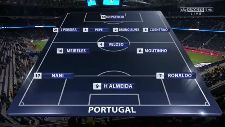 Rui Patrício (Sporting); João Pereira (Valencia), Pepe (Real Madrid), Bruno Alves (Fenerbahçe), Coentrão (Real Madrid); Raul Meireles (Fenerbahçe), Miguel Veloso (Dínamo de Kiev), João Moutinho (Mônaco); Nani (Manchester United), Hugo Almeida (Beşiktaş) e Cristiano Ronaldo (Real Madrid)